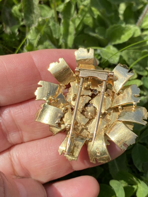 Broche vintage MAUBOUSSIN en or jaune 18k (750 millièmes) texturé et platine ( 950 millièmes) parsemée de diamants de taille brillant.